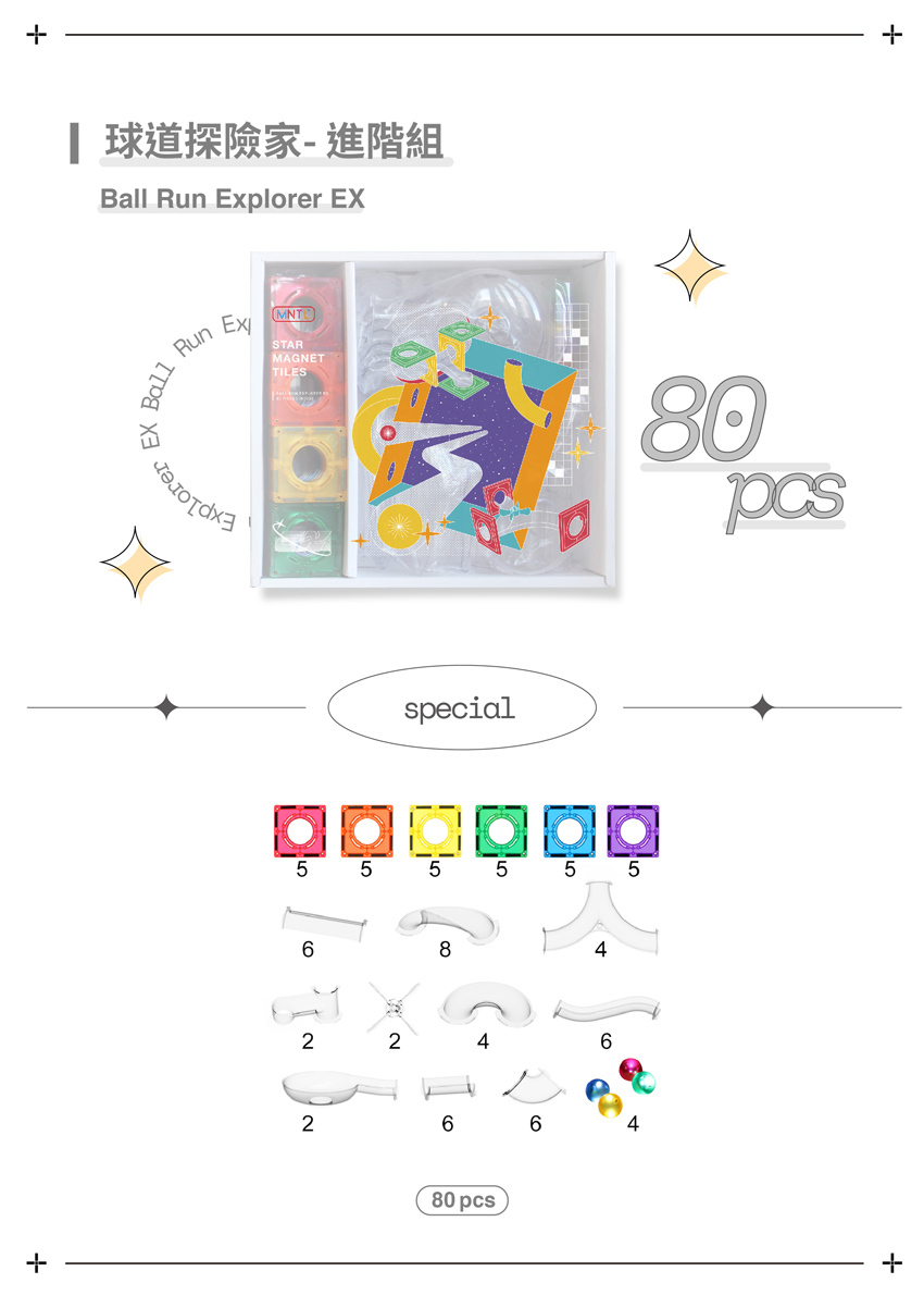 結合建構磁力片的特性與滾球遊戲的趣味性,不同的高度、彎度、長度的球道管,球跑動的速度也會跟著改變喔!