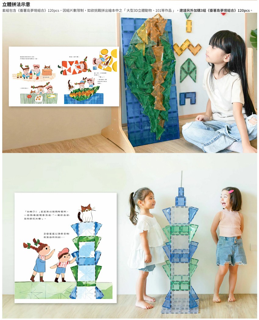 套組內含磁力片120pcs、繪本、20張圖卡,不含眼睛