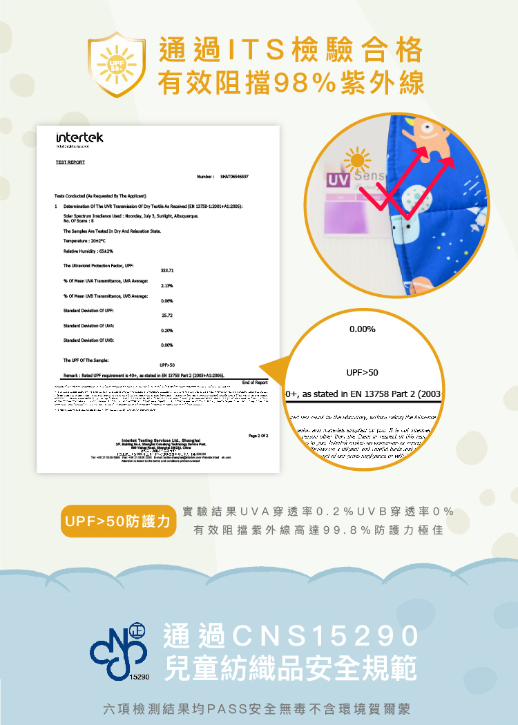 ⭐ 防曬檢驗合格,有效阻擋98%紫外線
