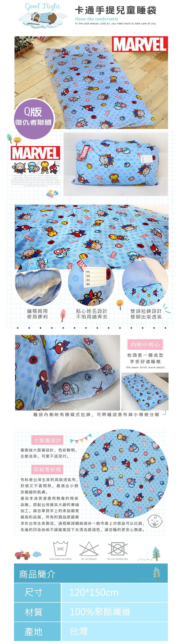 MIT台灣製卡通圖樣幼教兒童睡袋組- Q版復仇者聯盟