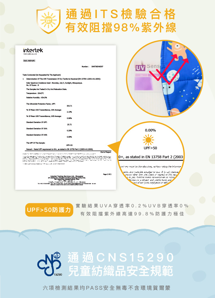 ⭐ UPF50+防曬合格檢驗有效範圍98%