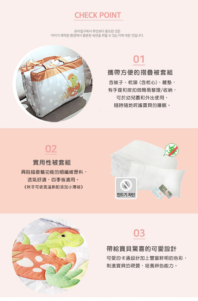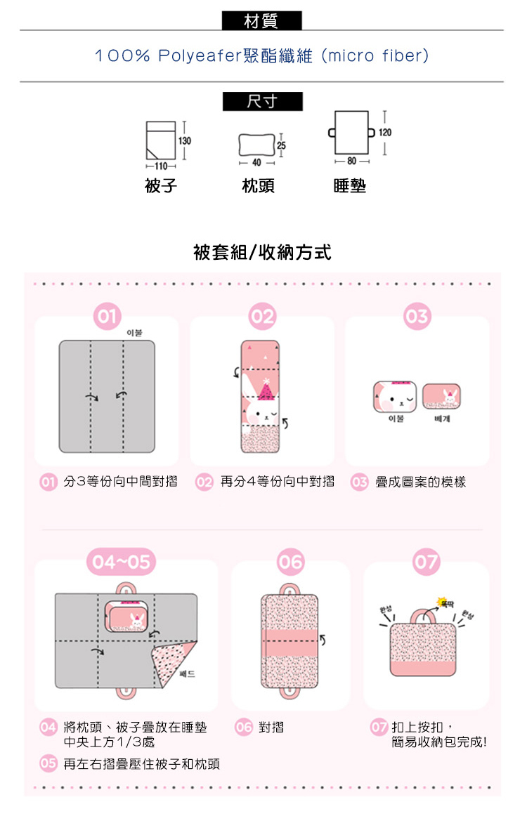 ◆內容物:被子(1張)枕頭(1個/含枕心)+睡墊(1張)