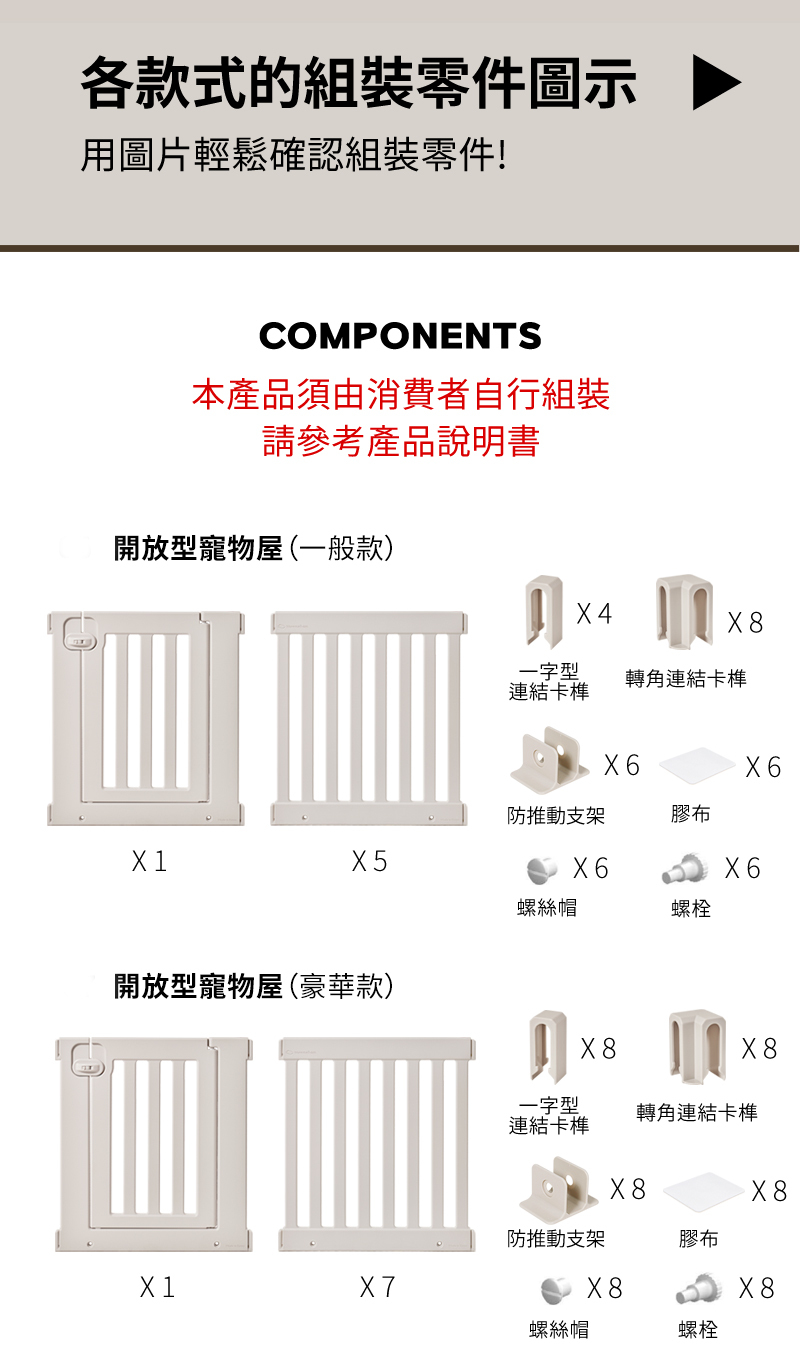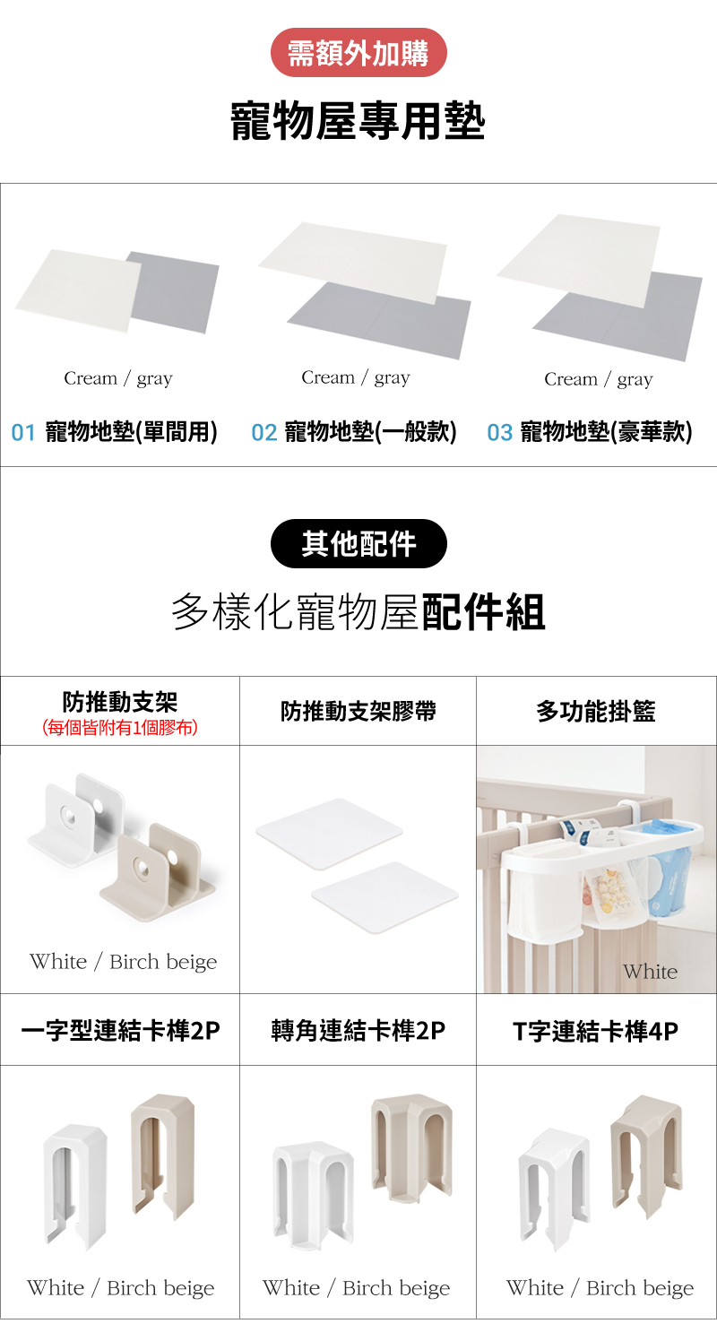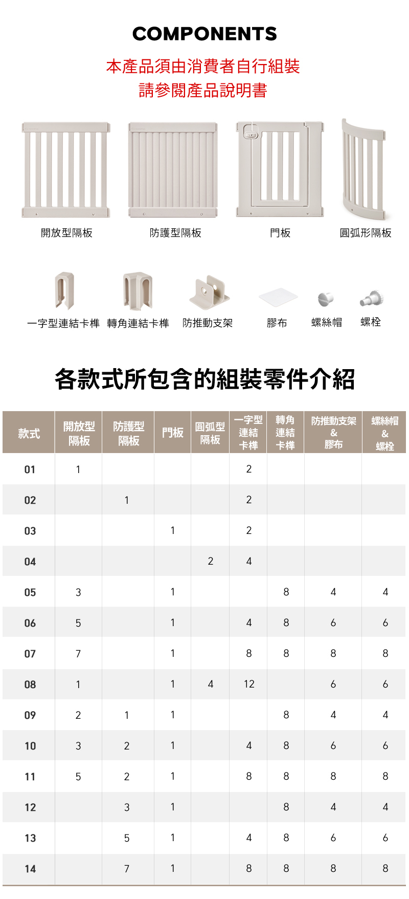 內容物 - 門板 / 圍欄片 / 連結卡準 / 防推動支架