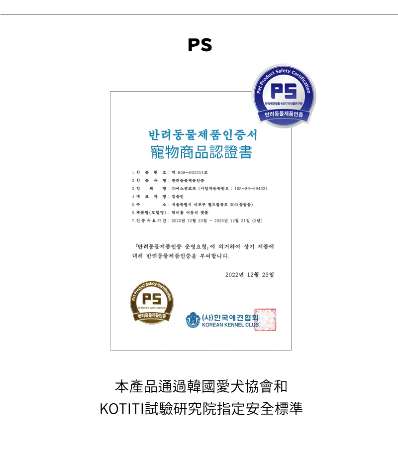 ▲ 通過韓國愛犬協會及 試驗研究院的多項安全標準